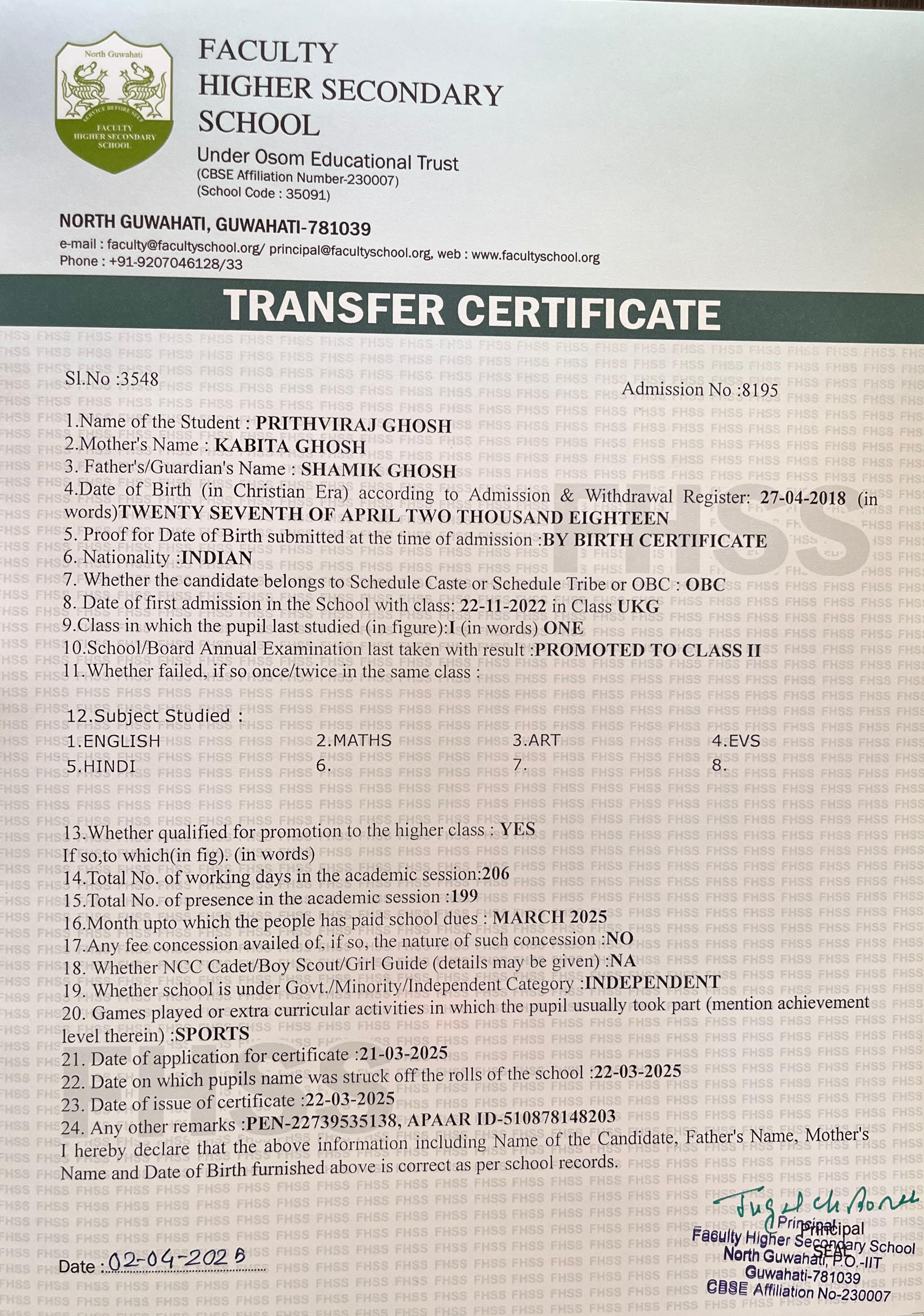 | 13 | PRITHVIRAJ GHOSH | Class 2 | 2025 | Download |
