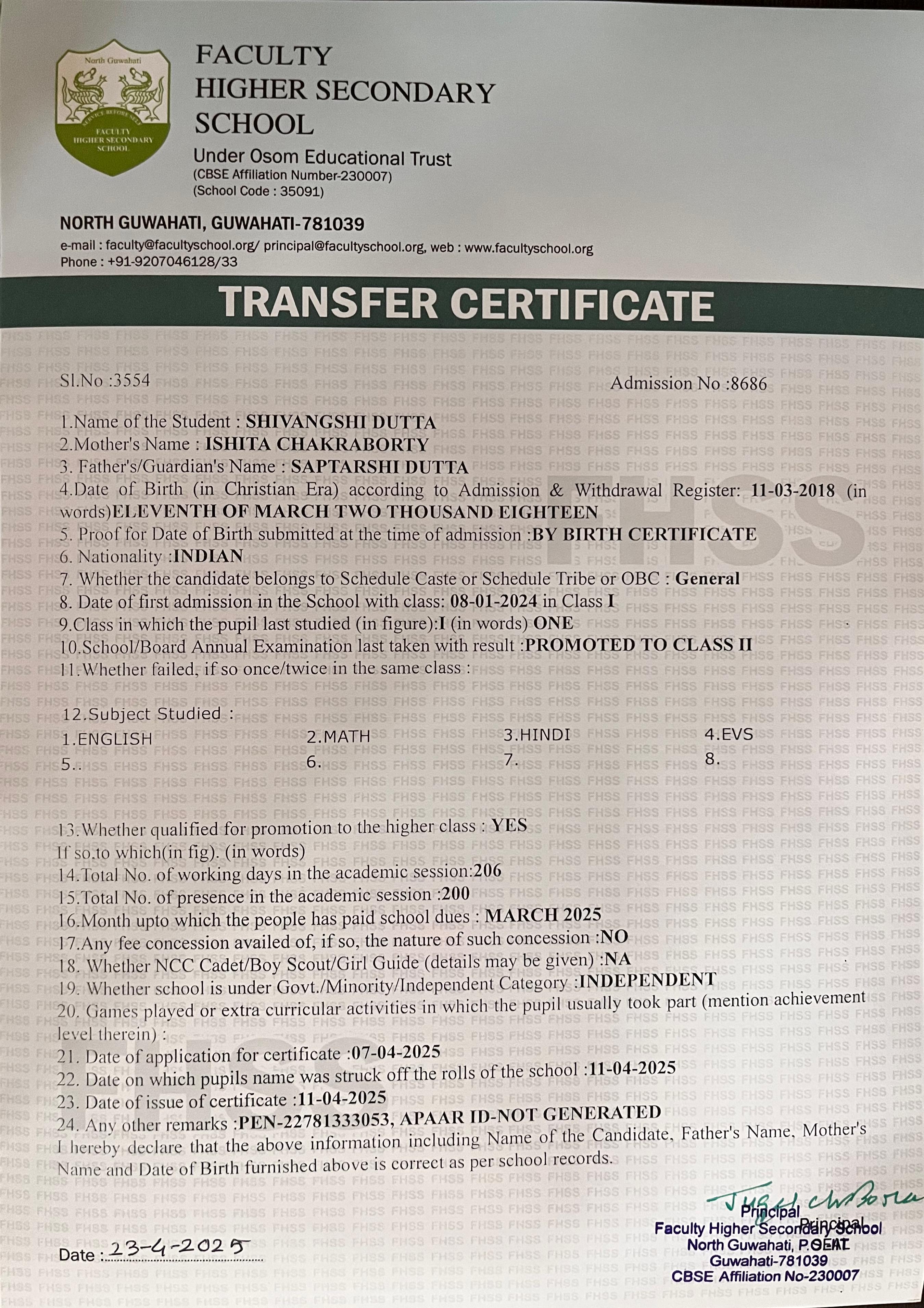 | 17 | SHIVANGSHI DUTTA | Class 2 | 2025 | Download |