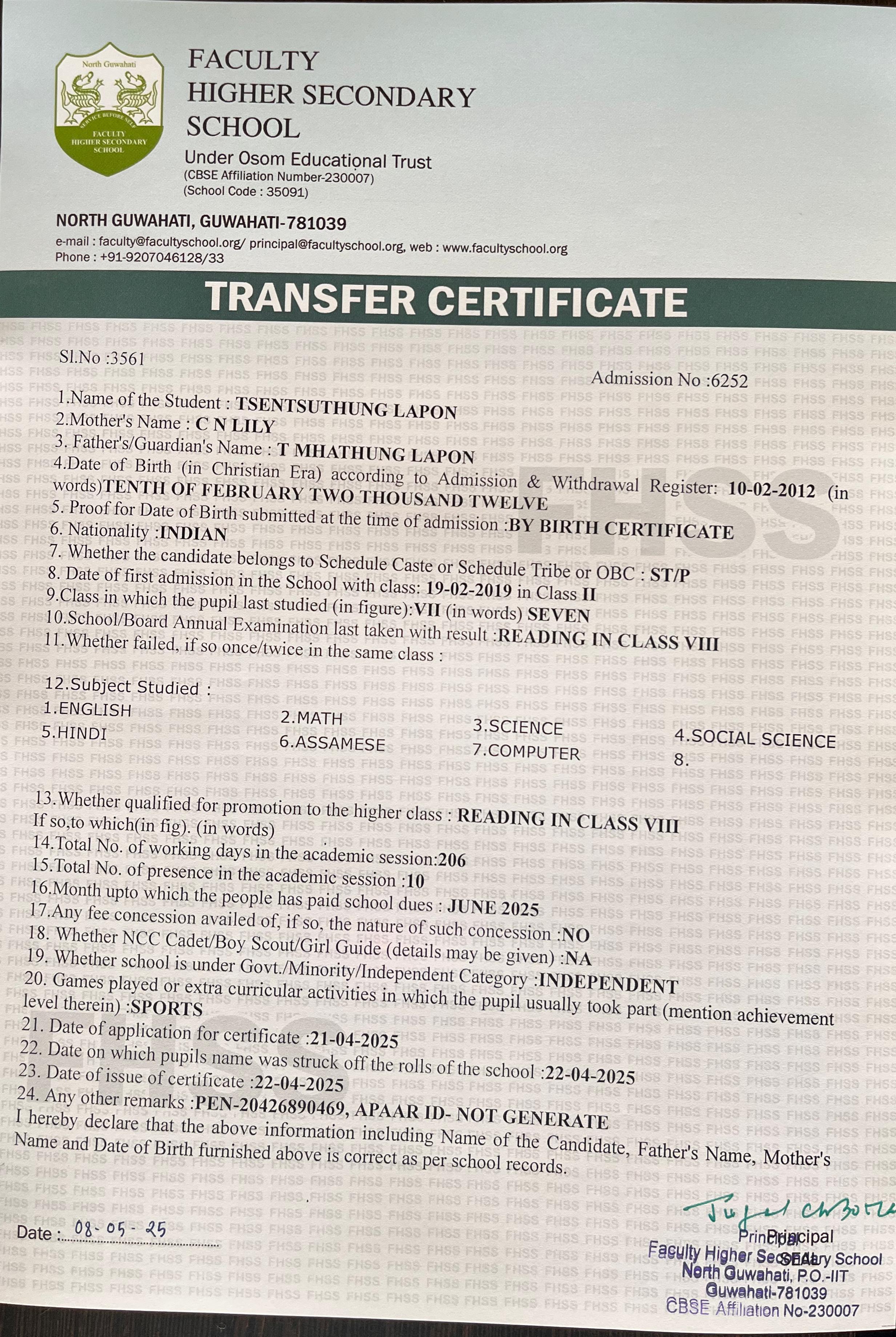 | 20 | TSENTSUTHUNG LAPON | Class 8 | 2025 | Download |